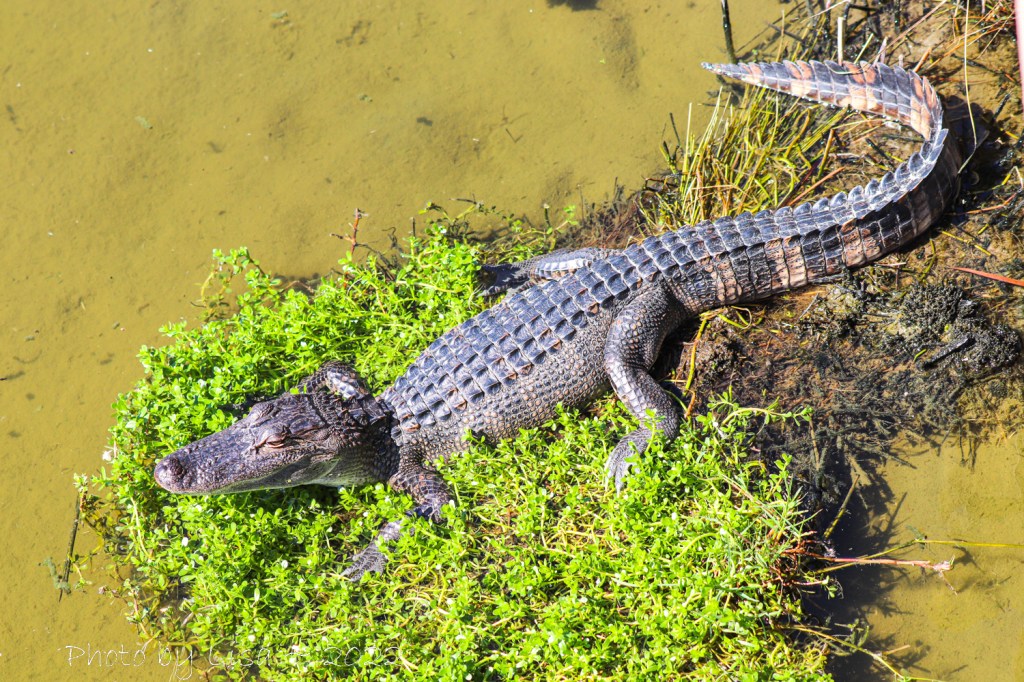 The alligator below is a wild alligator we found down below the walkway. He looks like a young one to me. I thought the colors in his tail were really beautiful. The greenery complimented him 😊🐊