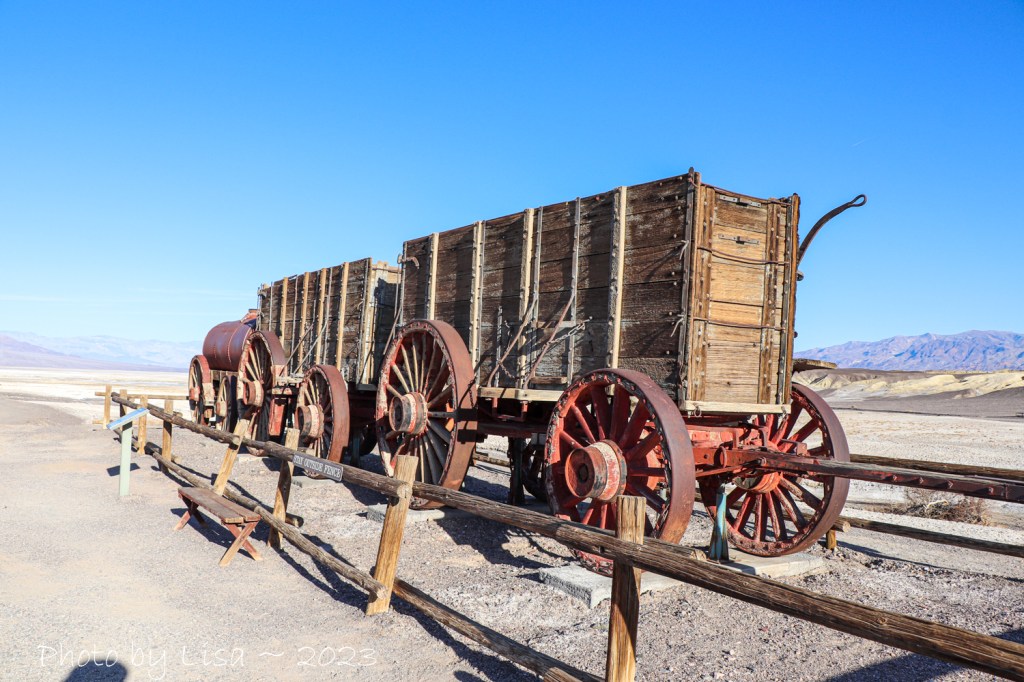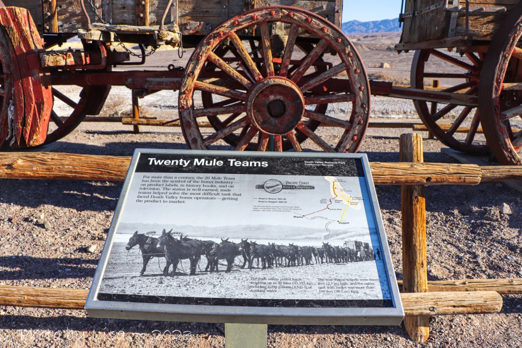 Our first stop was Harmony Borax Works. If you’d have asked me a few weeks ago what borax was, I’d probably have said “something my grandmother used for cleaning”. And I assume I’d have been right. What I didn’t know was what borax really was, and where it came from. Borax is a mineral, and the common name for sodium tetraborate. It occurs naturally by repeated evaporation of seasonal lakes. Borax was discovered in Death Valley in 1881. From 1883-1888 borax was hauled out of the valley by teams of 16-20 mules, depending on the size of the load. The famous twenty-mule team actually consisted of eighteen mules and two horses at the rear. The rear wheels of the wagon were seven feet high and the entire unit with mules was more than one hundred feet long.