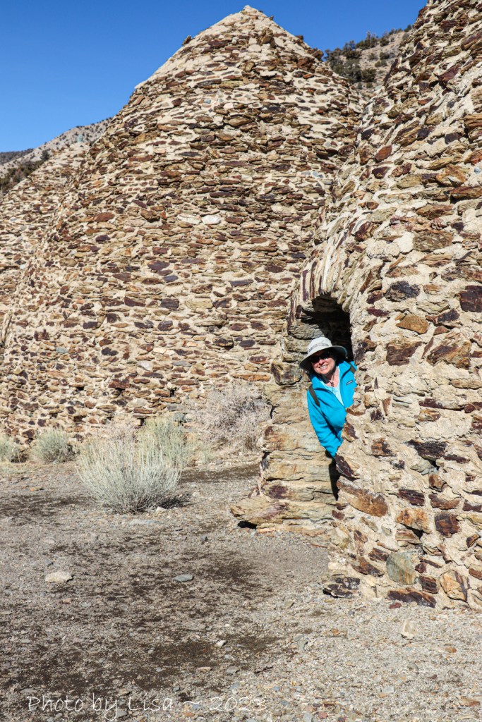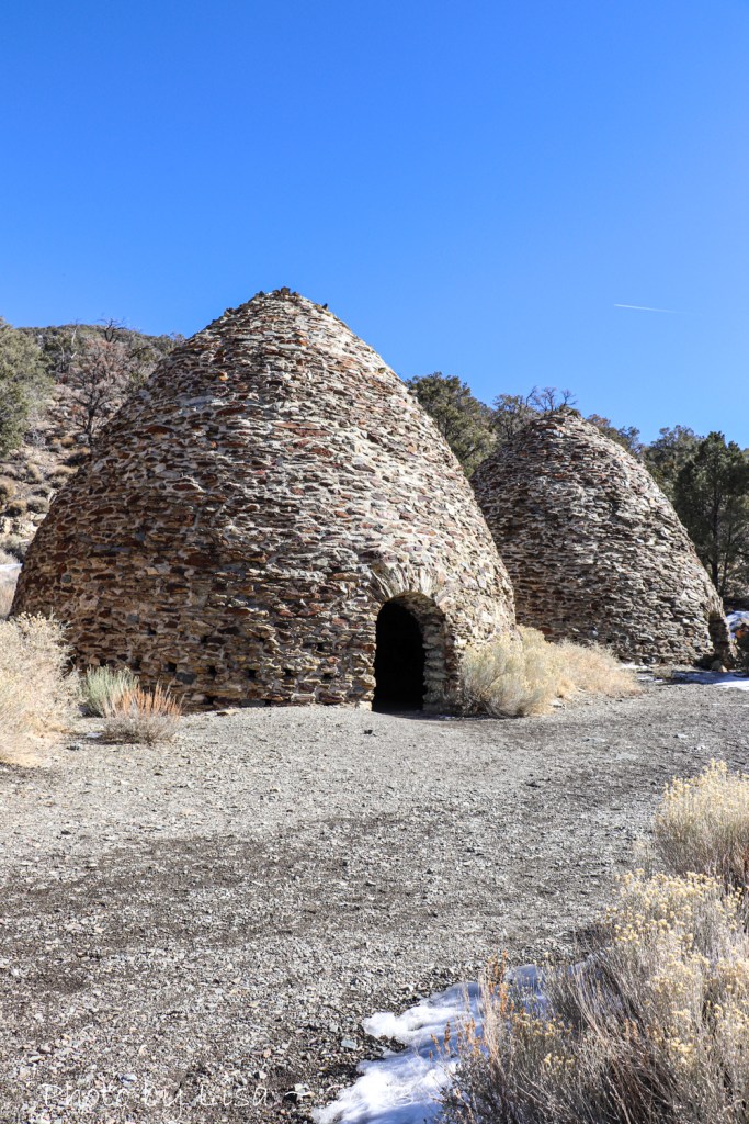 Our next stop was Wildrose Charcoal Kilns. The drive out and back was much longer than we expected, and our slow assent to the base of the mountains in Wildrose Canyon took us to the snowline! The kilns were built in 1877 and remain in excellent condition. They supplied charcoal for two lead-silver smelters about twenty-five miles away where fuel was scarce. Workers would fill the kilns with pinon pine logs cut from the surrounding hillsides and fire them. After a week of smoldering, about two thousand bushels of charcoal were ready to be hauled to the smelters. The Kilns were only used for a couple of years.