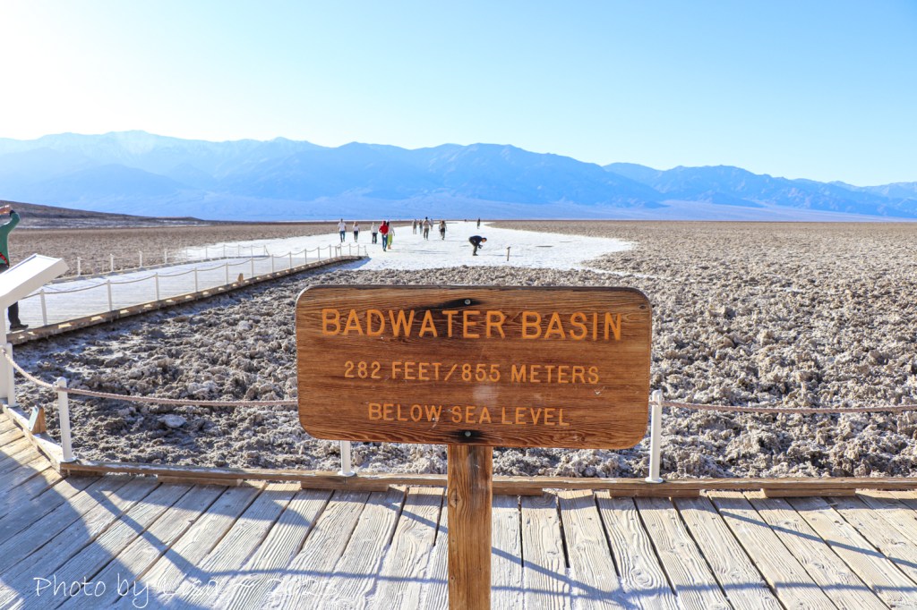 Perhaps the most mind-blowing experience of our entire visit at Death Valley was visiting Badwater Basin. Named for the small salty pool of water pictured below, it’s said to have been too bad for mules of early settlers to drink. Visitors must remain on the boardwalk to help protect the tiny snails that live in the water area.